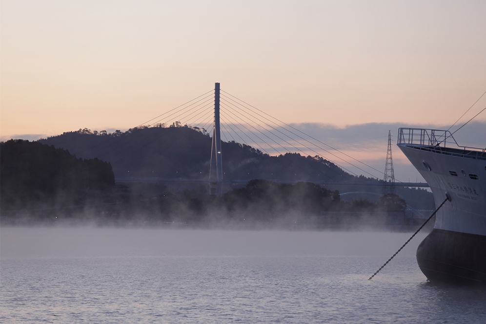 Sea smoke is a mist that appears to rise from the surface of the sea when the water temperature is higher than the air temperature. It is one of the iconic winter scenes of Kesennuma, created as cold air from the land moves over the sea and cools the water vapor above the surface.